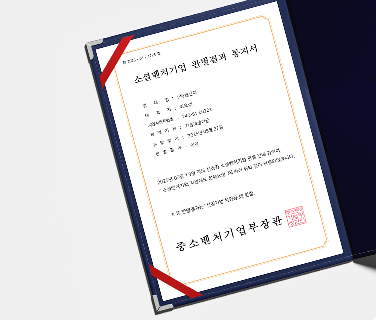 공식 인증받았습니다. 사회적 가치와 혁신적 기술력을 동시에 인정받은 검증된 기업입니다.
